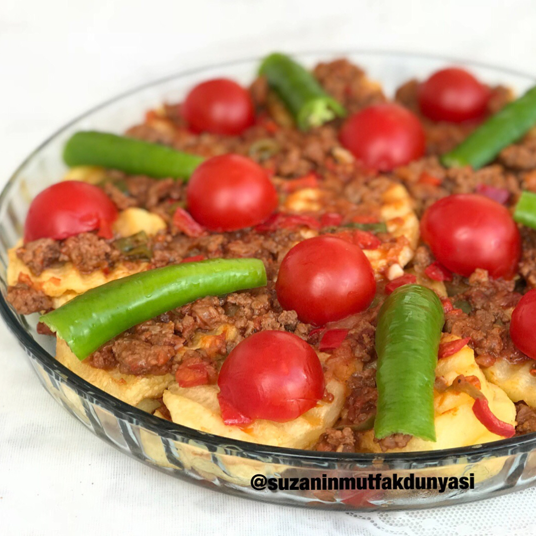 Fırın tepsisine önce patatesler daha sonra kıyma şeklinde sırası ile koyarak tepsiye yerleştirin üzerini domates ve biber ile süsleyerek 180derece fırında hafif kızarana kadar pişirin fazla pişirmeye gerek yok zaten patates ve kıyması piştiği için ,deneyeceklere şimdiden Afiyet olsun'na tesekkurler.